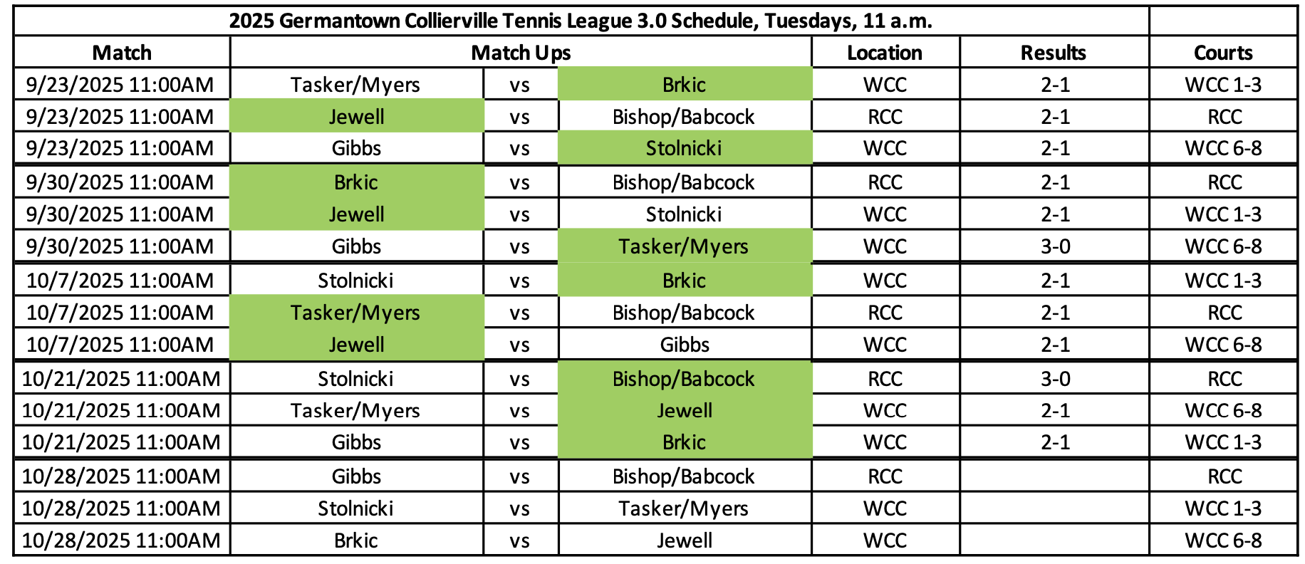 The Germantown Collierville Tennis League is a tennis league comprised of teams from the following facilities:
