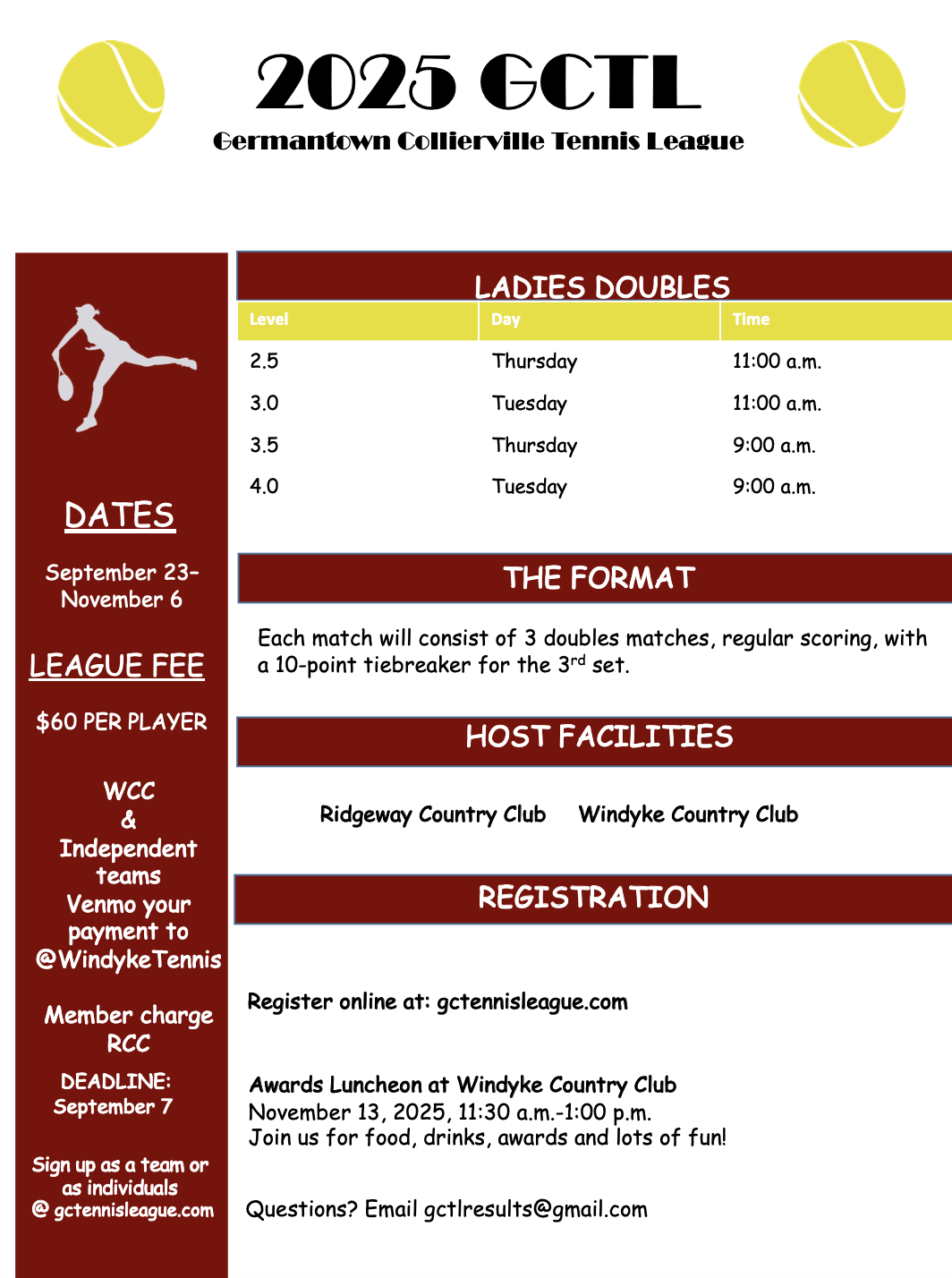 League fees are $60 per player. The league fee is $80 if you are on two teams. These fees are payable to GCTL. Please give your payment to your home facility. Venmo payment is the preferred payment method. Contact Sherrie to make other payment arrangements.